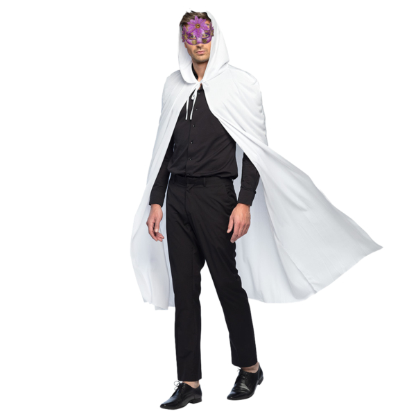 Venetiaans Gemaskerd bal verkleedkleding – Met oogmasker paars – Lange mantel wit – met capuchon